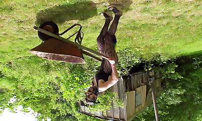 Mature fat fuckslut Hana is locked in stocks as she strokes
