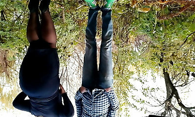 Squashing my mummy in law's fat ass in a leather skirt before she helps me piss outside