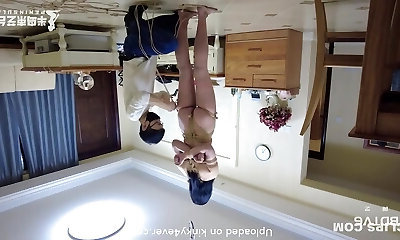 Stylish tattooed brunette in restrain bondage tied with ropes in BDSM torture