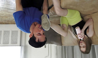 Barefoot Footjob under table and CUM! Ballkicking Femdom Foot Fetish CBT Domme Redix
