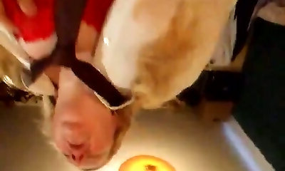 Ugly nerdy pigtailed brunette gets forearms tied up behind back and gullet banged